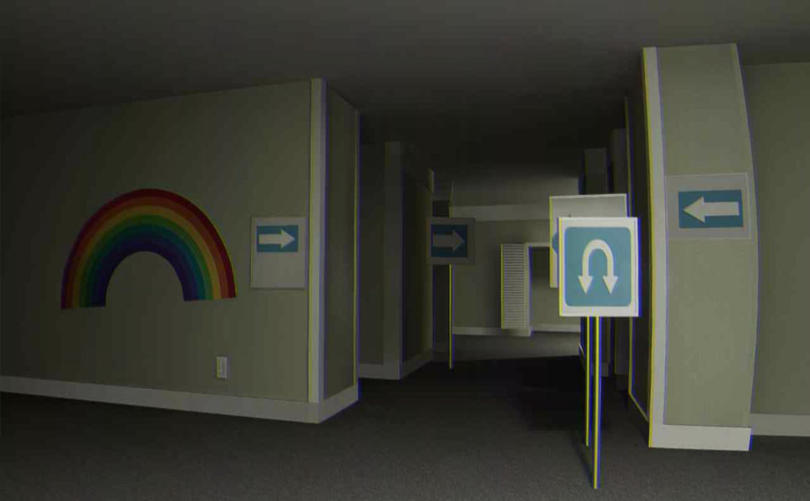 The environments are your typical Backrooms Greatest Hits, but an immense amount of care has been put into making the camera feel like an old camcorder. The framerate is locked at around 40 FPS, there's dithering and artifacting in the shadows, and swinging the camera around gets picked up by the mic.